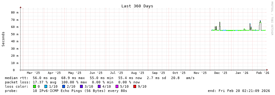 traceroute to 2001:690:1fff:1600:eade:27ff:fec9:67ec (2001:690:1fff:1600:eade:27ff:fec9:67ec), 30 hops max, 80 byte packets - Generated at 2026-02-21 06:00:01